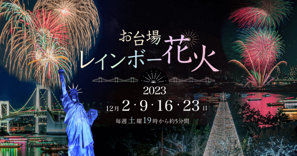 空気が澄みわたり、夜景がひときわ美しく見える冬のお台場で行われる花火大会。12月の毎週土曜(12月30日は実施しない)19:00から、各日約1100発の花火が打ち上がる。アミューズメントスポットが充実するお台場で子供とたっぷり遊んだ後、夜空に広がるダイナミックな彩りを満喫したい。華やかな光景は年末の素敵な思い出づくりにぴったりだ。 💡見どころ この時期のお台場は、クリスマスイルミネーションがあちこちにともり幻想的な雰囲気に包まれているので、ぜひイルミネーションと花火の両方を存分に楽しみたい。また期間中の12月23日(土)は音楽と連動したミュージック花火も実施。いつもとはひと味違った冬花火の魅力が満載だ。